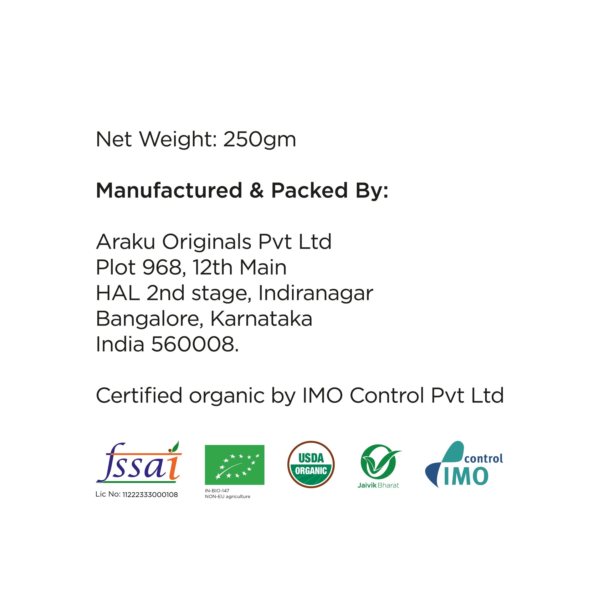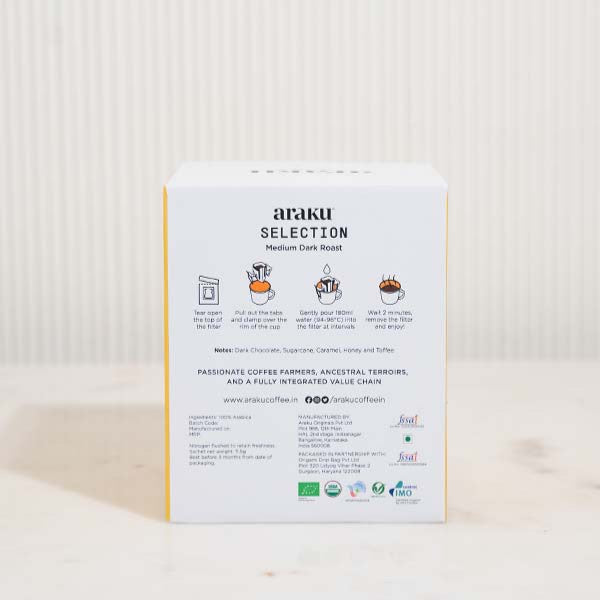 Filled with 100% organic ground Selection beans from ARAKU Coffee’s tribal farmer community