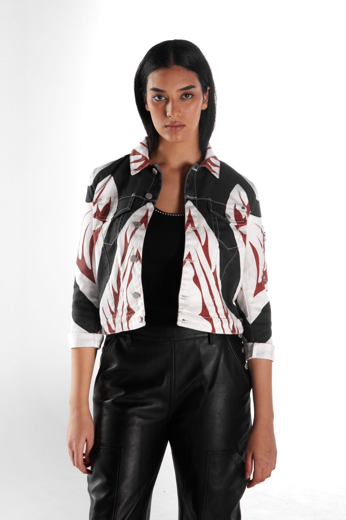 Fully printed denim jacket with buttons and 3/4 sleeves.