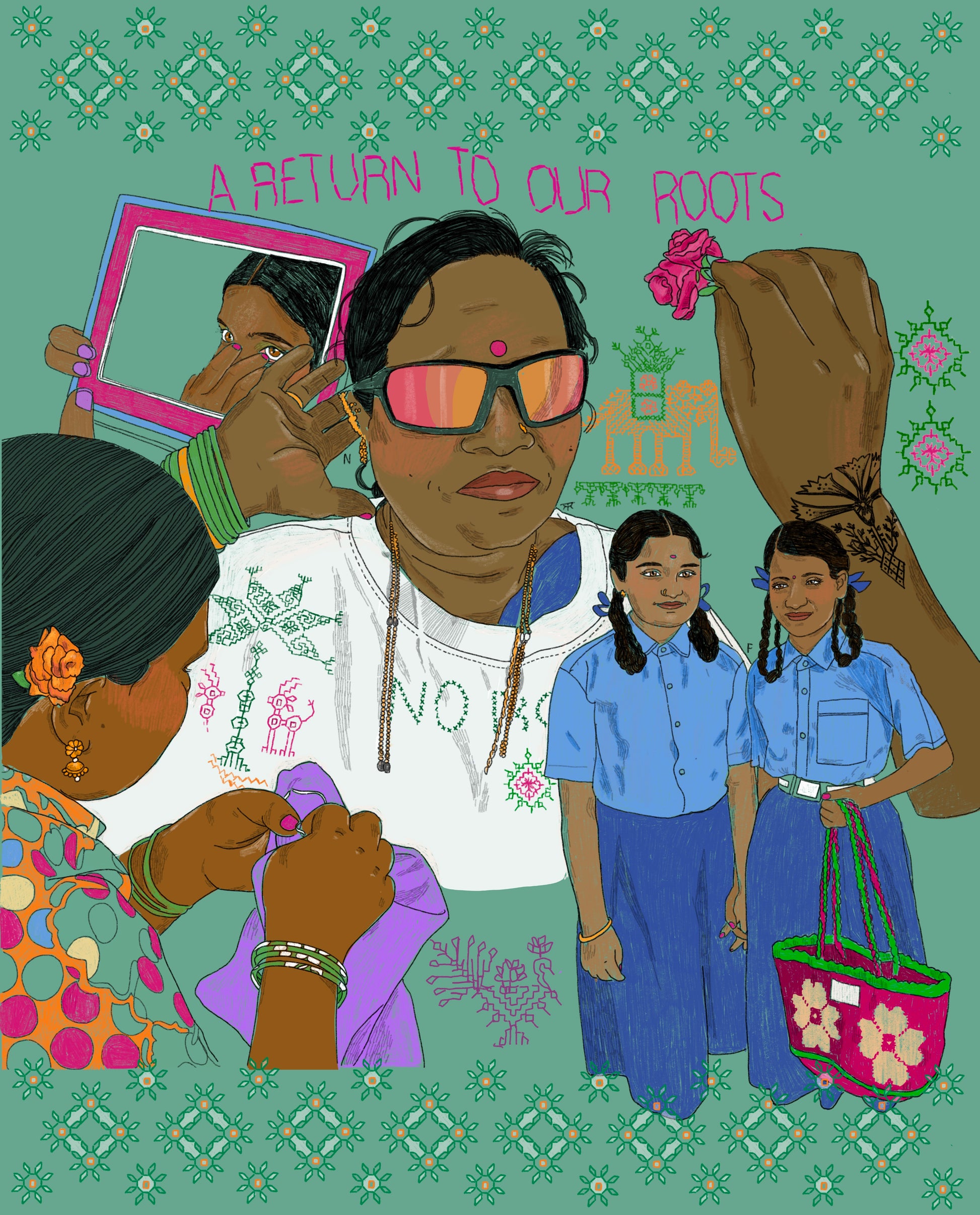 Created by Nour Flayhan, this beautiful illustration celebrates all the memories we made through our journey of Kasuti. The illustration vibrantly depicts the little moments that stuck with us on our travels to North Karnataka. The artwork visually translates how we have carried the art of Kasuti with us on our way, inspiring them with the tales of Kasuti and embracing the stories narrated in the embroidery āØ