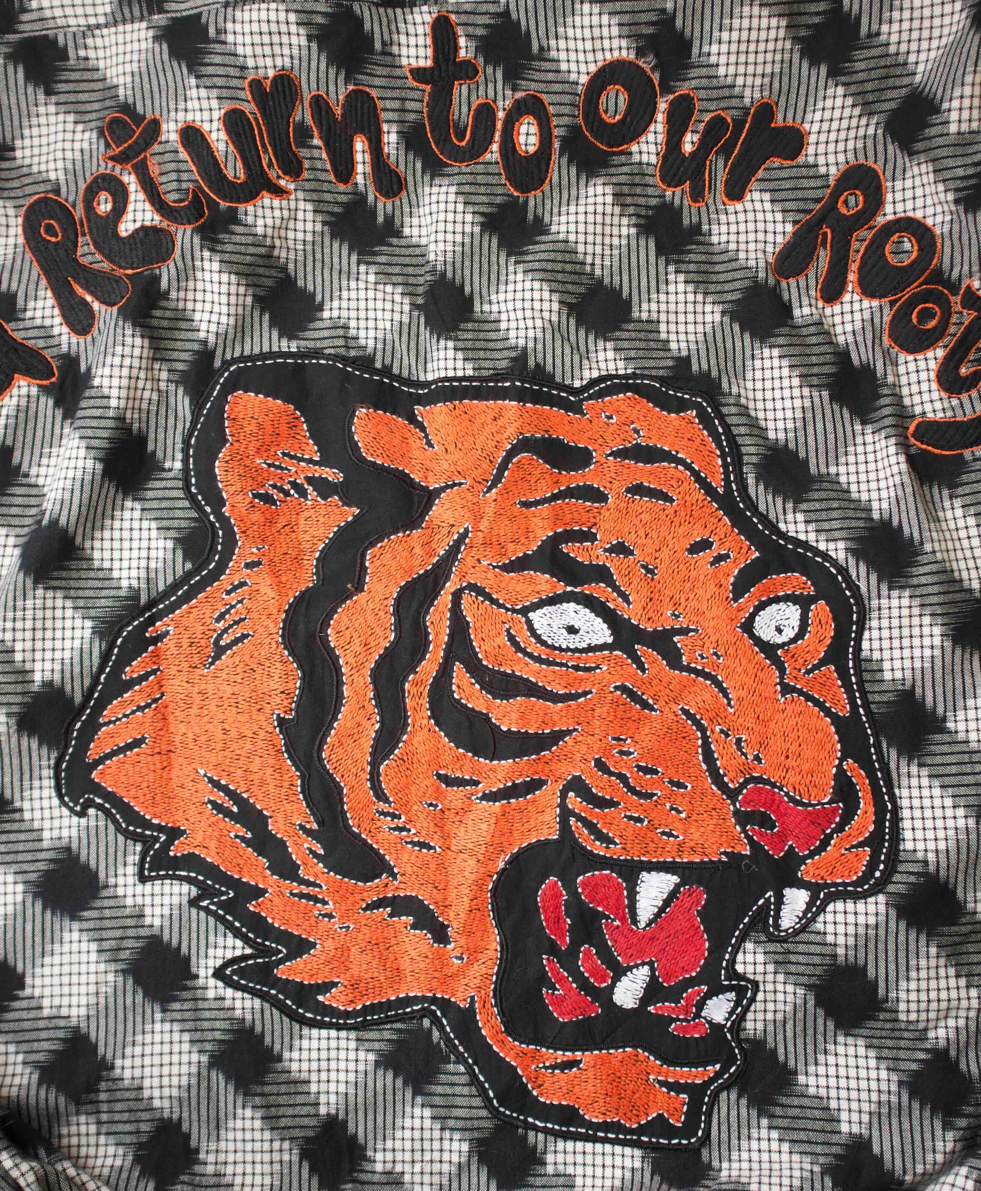 Hand-embroidered Kantha tiger face on the back, with letters and appliqué paw details on the front • Relaxed, oversized fit • Artisanal charm • Handwoven ikat • Lined with soft mul cotton • Made in West Bengal