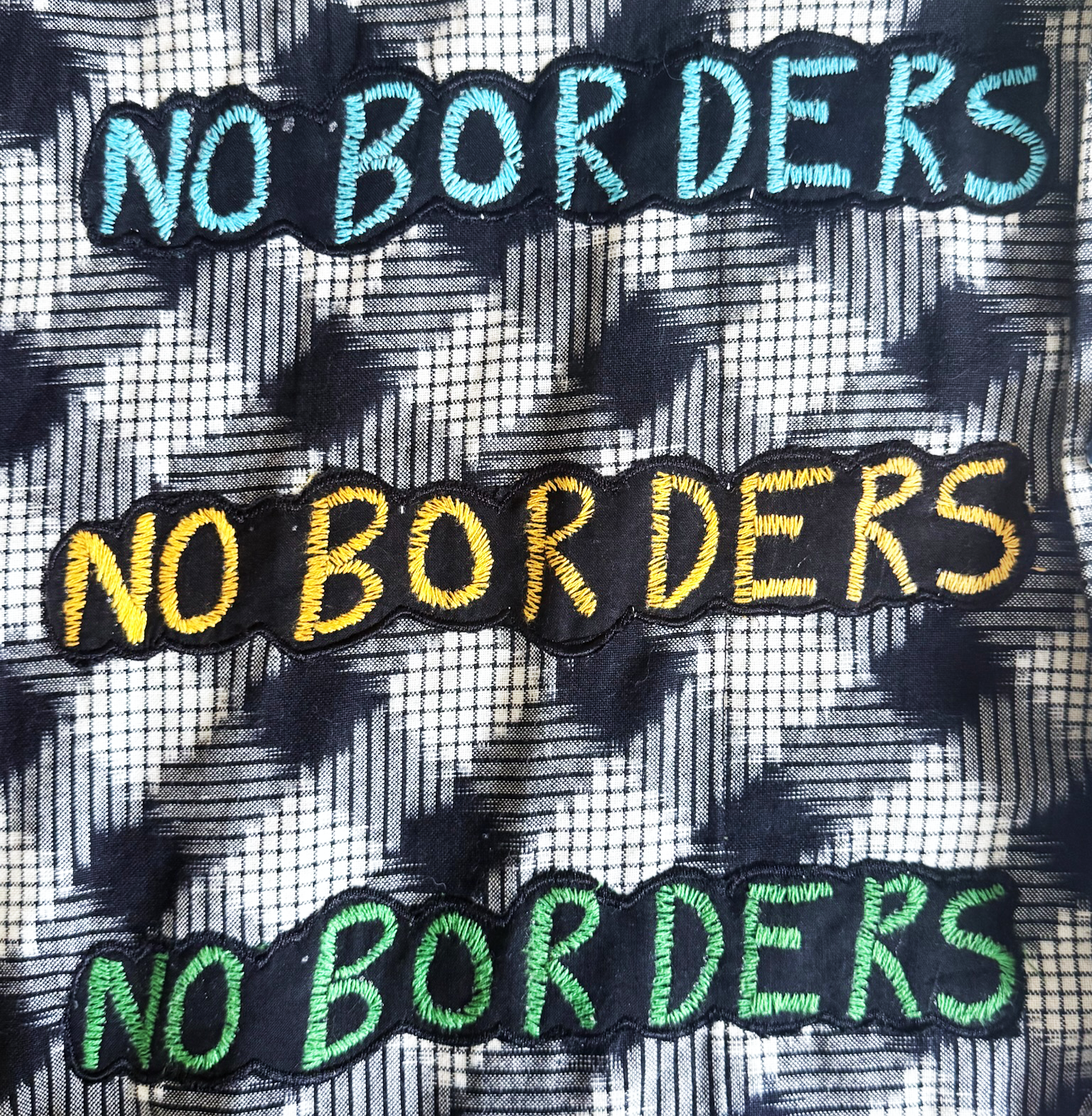 - Details: Raised appliqué patchwork, brand name in Kantha embroidery, mul green lining