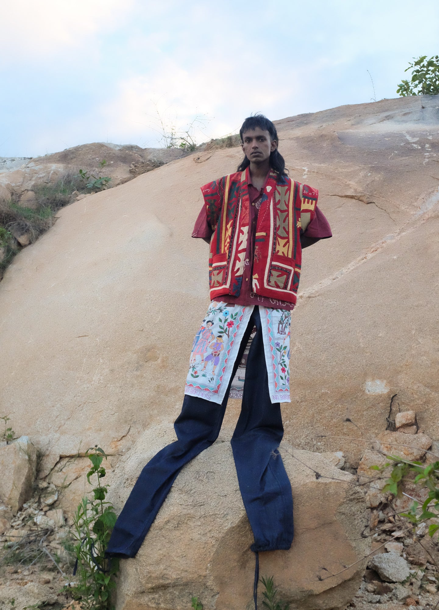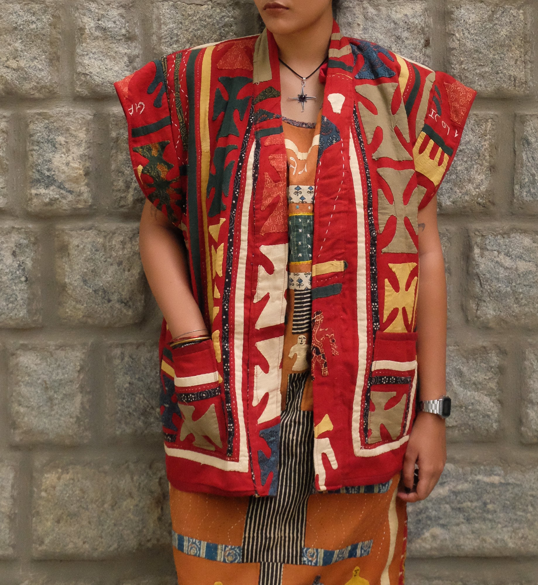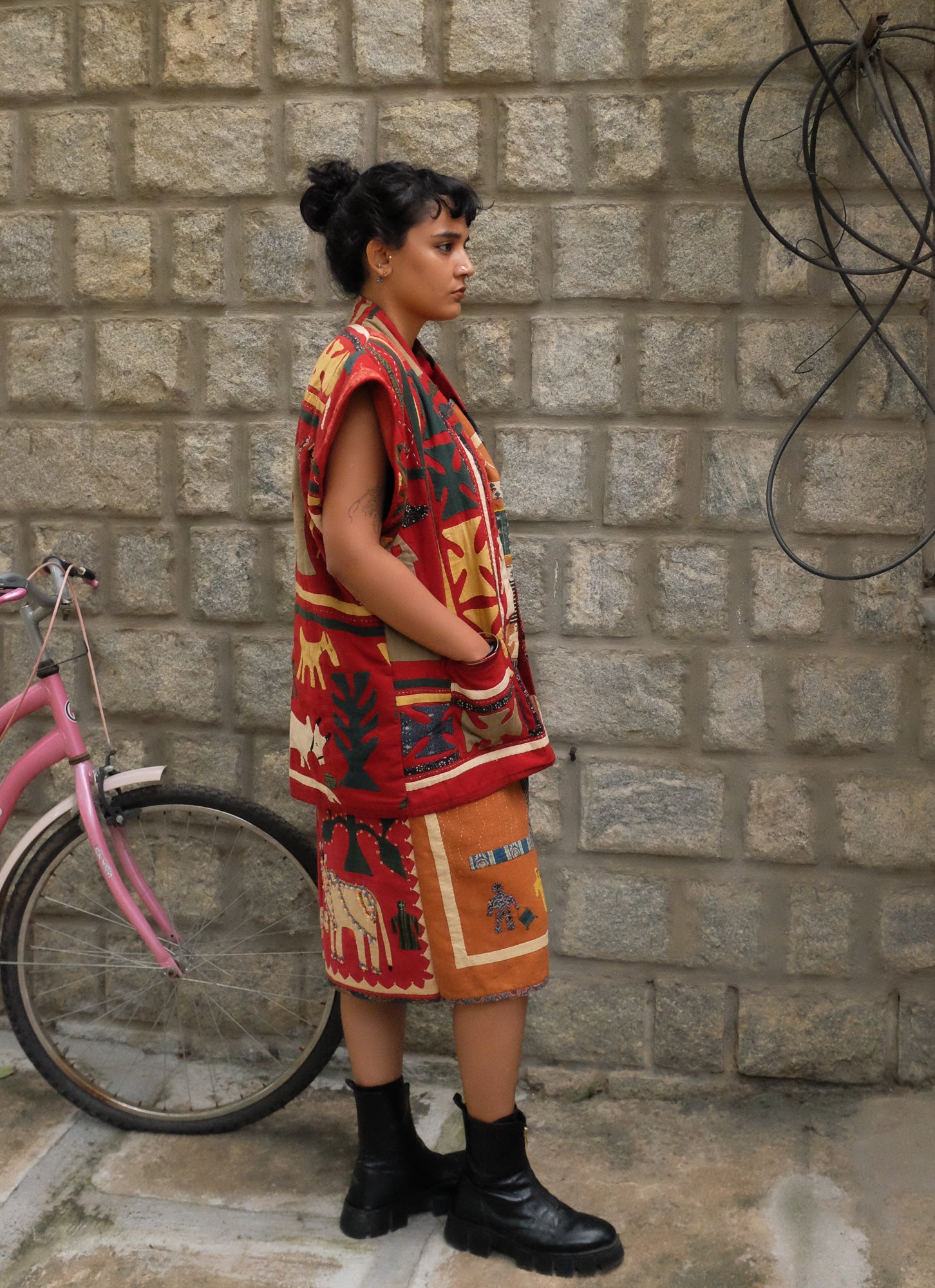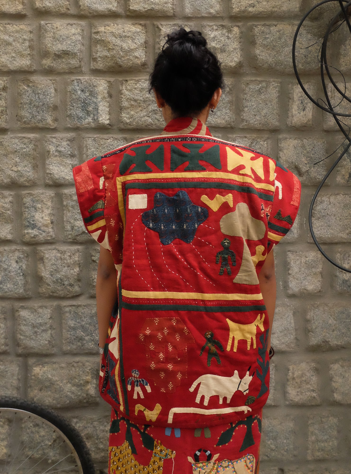 Our Upcycled Kimono-Inspired Masterpiece Jacket is a heartfelt project that transforms art into wearable fashion. Originally designed as wall hangings, these one-of-a-kind jackets feature exaggerated shoulders inspired by traditional Kimonos. Created with our artisan friends in Kutch, Gujarat, the applique patchwork depicts everyday scenes from the artisans' village, capturing the essence of their community and culture š¦