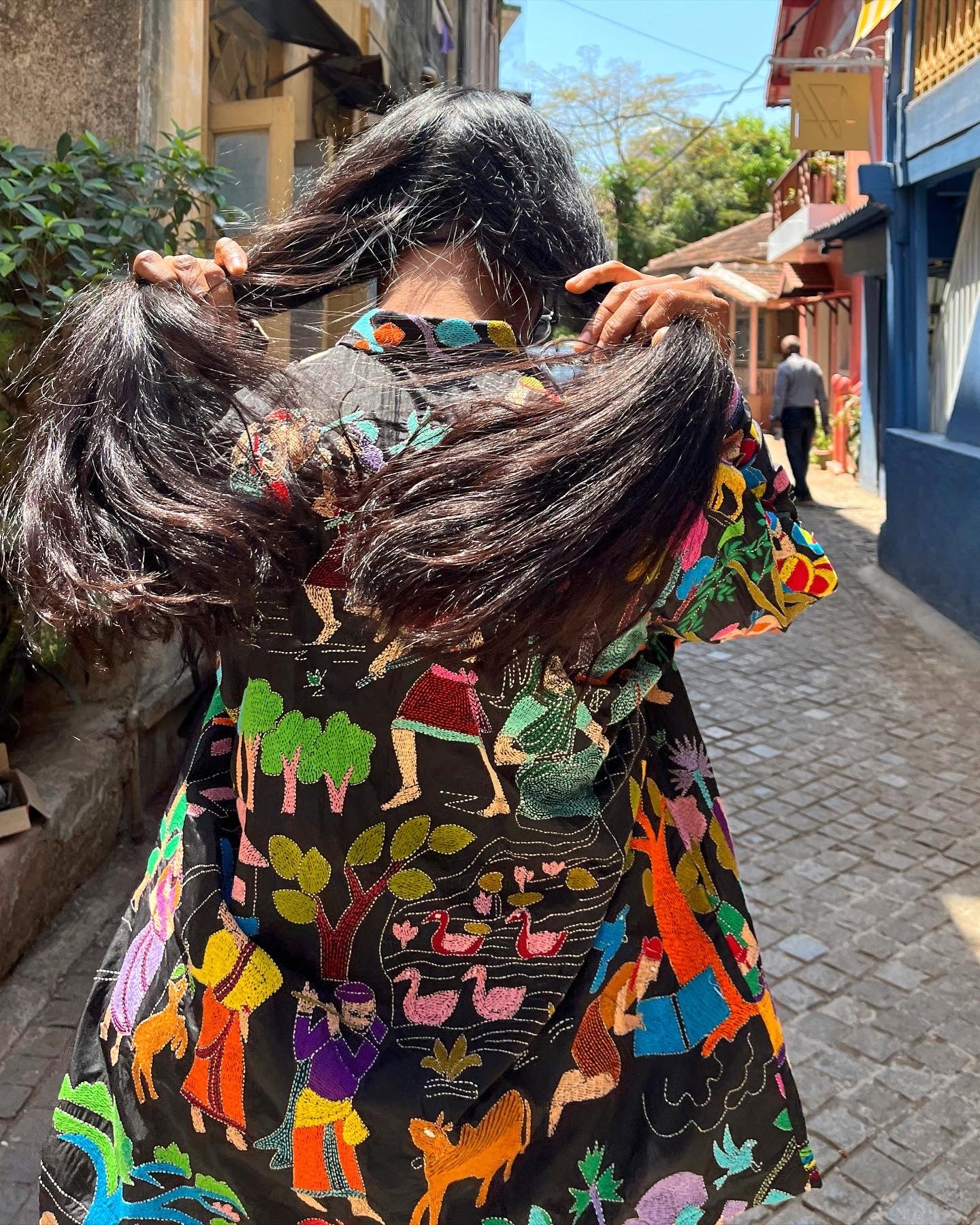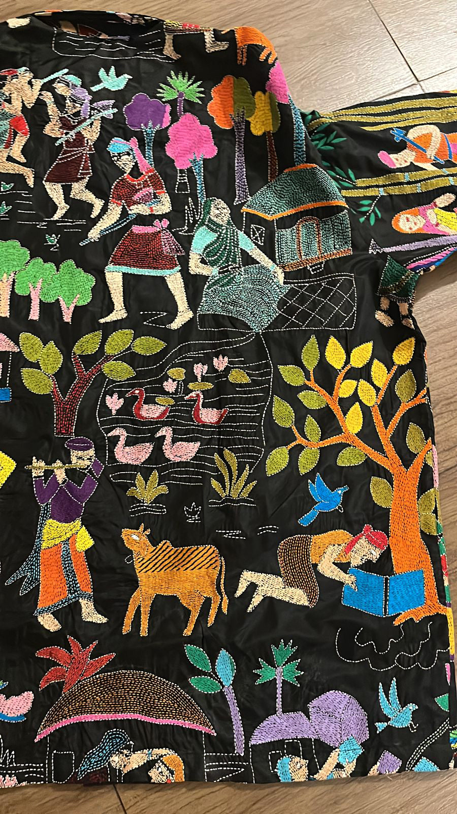 The carefully stitched and lovingly crafted Kantha shirt is made by our Artisan Ajija Sultana. Ajija and her team of women artisans embroider this vibrant story on a locally sourced fabric called Tussar Silk. The design is inspired by everyday scenes at the village markets of Bengal.